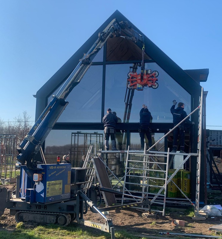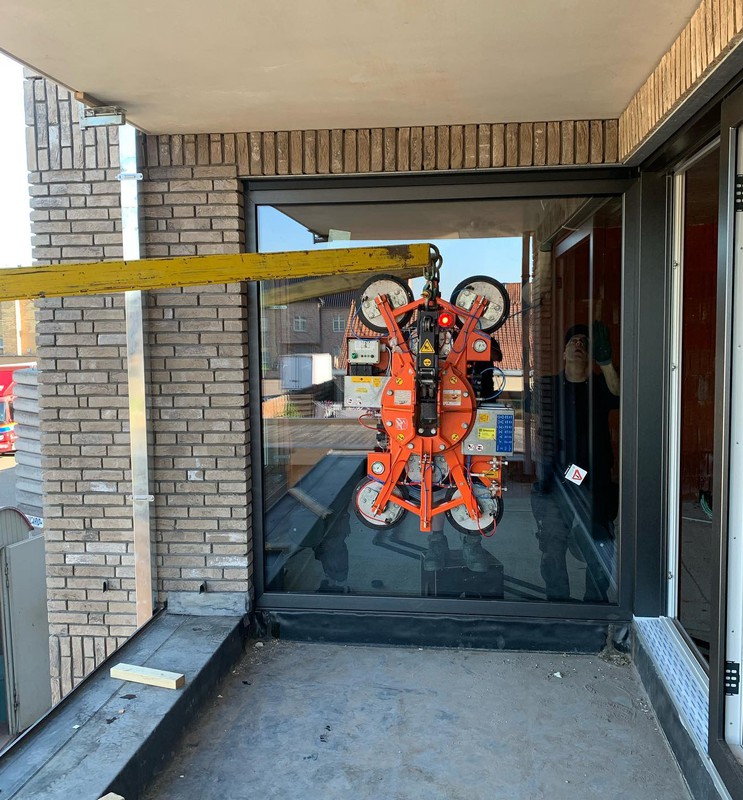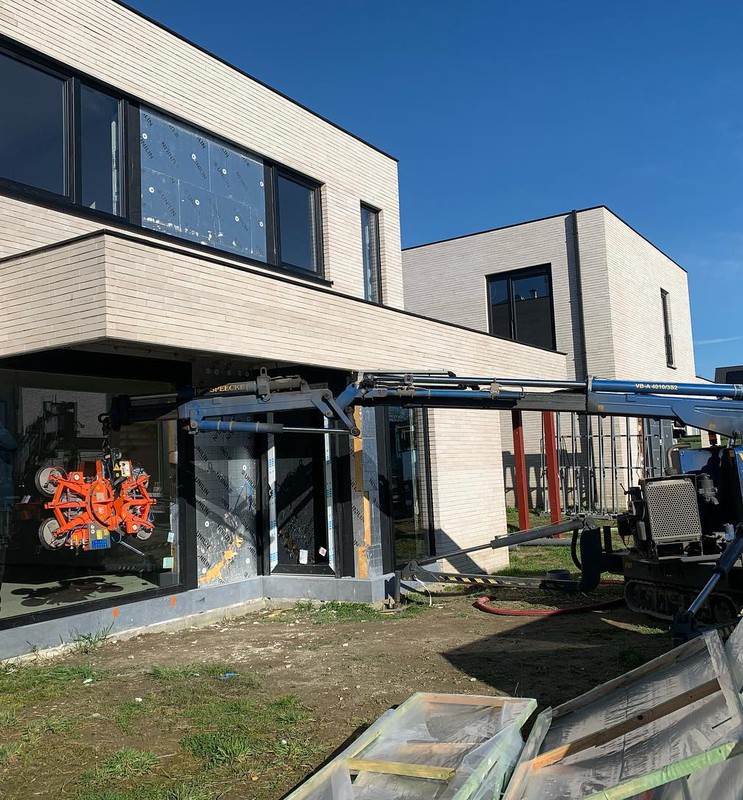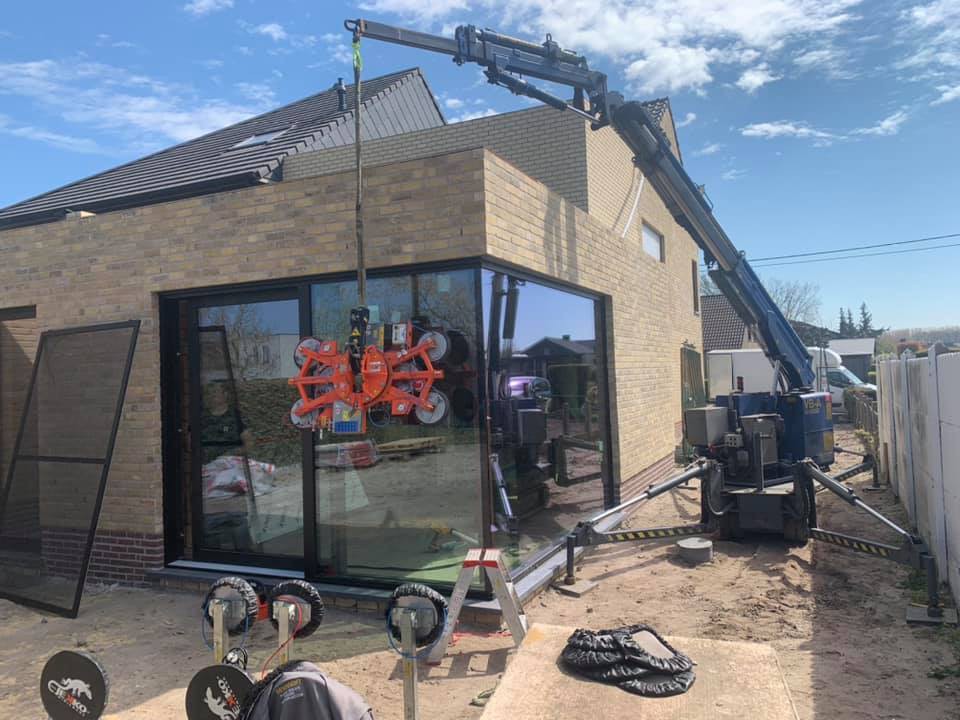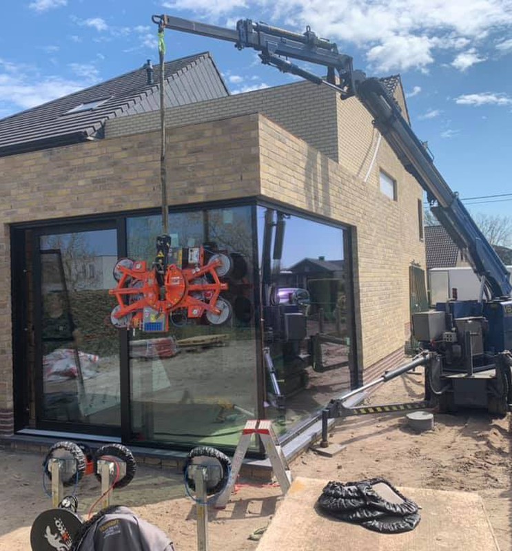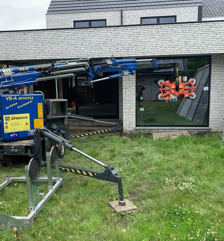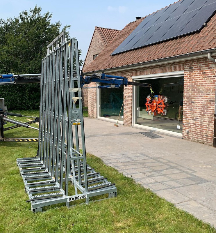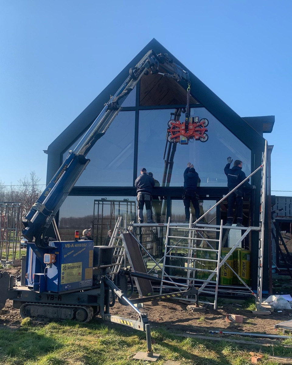 Zelfs grote glaspartijen en moeilijk bereikbare ramen worden veilig en efficiënt geplaatst dankzij onze eigen kraanwagens.